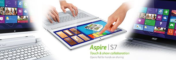 Tão fino como um smartphone, o Acer Aspire S7 é uma icónica combinação de potência e beleza. A utilização de linhas direitas, o vidro branco brilhante, a iluminação eletroluminescente, o alumínio anodizado e as dobradiças com dupla resistência (dual torque hinges), culminaram num Ultrabook que é um exemplo de tecnologia avançada e design inovador. O S7 está disponível em dois modelos, ambos com ecrãs LCD IPS de 1920×1080 (Full HD) de 13,3’’ e de 11,6’’. Estes Ultrabooks Acer são baseados em processadores Intel® Core™ i5 e i7 de 3.ª geração e possuem armazenamento com unidades SSD duplas configuradas em RAID0.