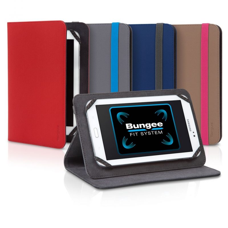 O sistema Bungee Fit, disponível em ambos os modelos e desenvolvido exclusivamente pela Targus, mantém o tablet arrumado com quatro bandas elásticas, uma em cada canto da capa, muito suaves que não danificam o equipamento. Este sistema faz com que a capa seja compatível com um maior número de equipamentos, pela forma como se consegue adaptar ao tablet. As Flip e Folio Stand são compatíveis com Samsung Galaxy (Tab e Tab 2), Galaxy Note, Google Nexus 10.1”, Asus TF700 e o TF300, e com todas as versões de iPad. Muito práticas e modernas, as capas parecem uma agenda, fechando-se como tal, com uma tira elástica colorida que se destaca da cor da capa. Disponíveis em cor toupeira com elástico rosa; vermelho com elástico cinzento; cinzento claro com elástico azul turquesa; e azul escuro com elástico cinzento escuro.