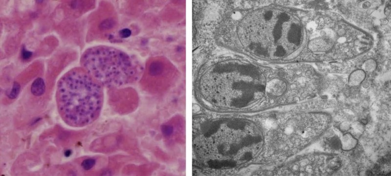 Geralmente, este tipo de micro-organismo se replica no interior de um hospedeiro até que passe a formar cistos, o que lhe permitirá invadir seus próximos alvos. Entretanto, segundo Grigg, o parasita age como um câncer no organismo das focas-cinzentas. Nos fígados delas, o parasita apenas se replica, até que o órgão seja destruído; de fato, as necrópsias dos filhotes mortos em Hay Island constataram que seus fígados se deterioraram completamente em decorrência da infecção.