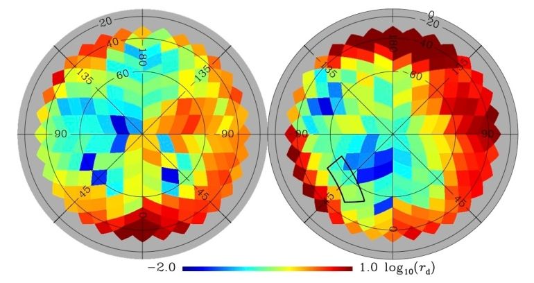 Agora, o mapa produzido por dados do Planck e armazenado no servidor de livre acesso arXiv demonstra que a polarização pela poeira é muito mais intensa na região averiguada pelo BICEP2 do que a equipe que opera este o telescópio considerou. David Spergel, astrofísico teórico da Universidade de Princeton e crítico do estudo do BICEP2, afirma que a maior parte do que este experimento viu “foi devido à poeira” (ver “Evidências da inflação cósmica desafiadas por novos estudos“). De fato, a região explorada pelo telescópio antártico não se encontra entre aquelas nas quais o Planck verificou pouca presença de poeira (como ilustra a imagem acima).