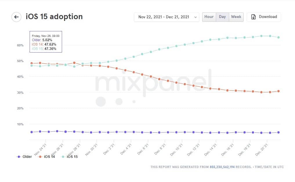 Estes números foram avançados pela empresa de análise de dados Mixpanel e refletem também que apenas 36% dos dispositivos da Apple estão ainda a correr o iOS 14. Apesar da taxa de adoção do iOS 15 ser elevada, estes valores estão ainda longe do conseguido pelo iOS 14 no mesmo período de tempo.
