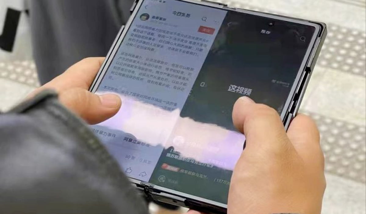 Tal como se vê na imagem, o smartphone dobrável está na sua posição aberta, sendo importante realçar o facto de que não é possível ver nenhuma marca ao centro.