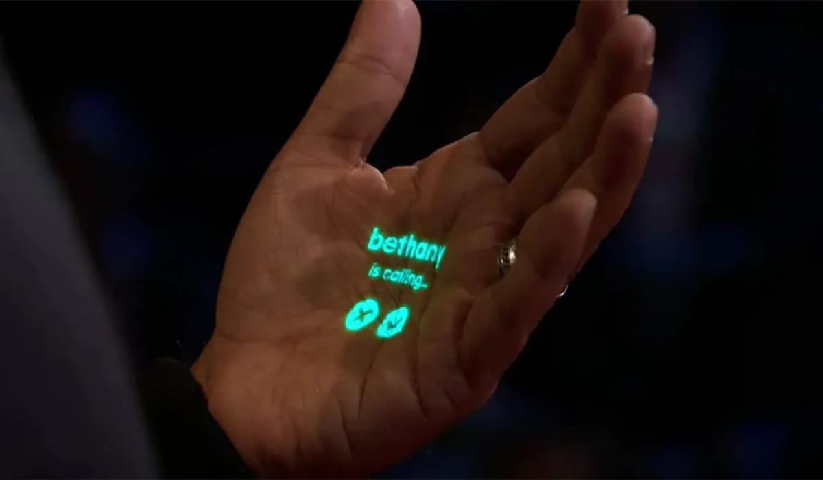 Além disso, o projetor do dispositivo exibe informações diretamente na mão do usuário, mas não fica claro se os ícones projetados são botões funcionais ou apenas decoração.
