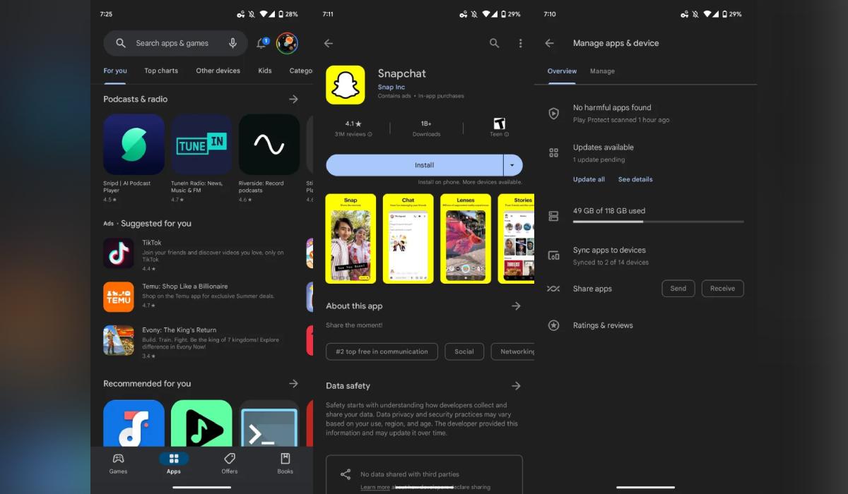 Até há pouco tempo, a Google utilizava um esquema de cores dinâmicas no campo de pesquisa, nas abas superiores e na barra inferior da Play Store. No entanto, esta funcionalidade de cor dinâmica não estava presente em todas as partes da aplicação. Por exemplo, em áreas como a página de actualizações “Gerir aplicações e dispositivo”, a cor de destaque continuava a ser o verde.