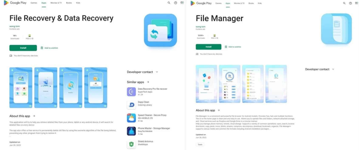 A empresa de segurança Pradeo relatou que duas aplicações na Play Store recolheram enormes quantidades de dados dos utilizadores, apesar de afirmarem que não o faziam. Mais de 1,5 milhões de pessoas descarregaram estas aplicações de Wang Tom. Pelo menos 1 milhão de pessoas descarregou a File Recovery e Data Recovery (com.spot.music.filedate), enquanto mais de 500 mil pessoas descarregaram a File Manager (com.file.box.master.gkd).