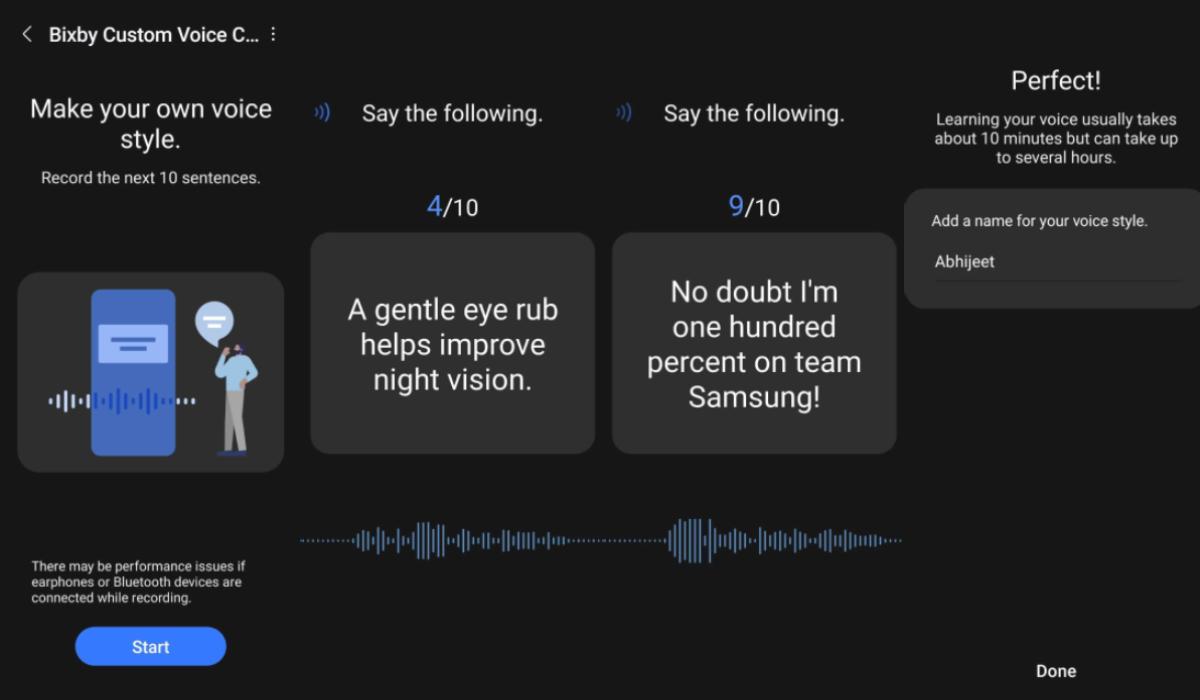 Depois de pressionares o botão “Iniciar”, terás de ler dez frases diferentes que aparecem no ecrã. Uma delas até te pedirá para declarares o teu amor pela Samsung. Após este passo, dás um nome à tua nova voz e o Bixby começa o processo de aprendizagem. Este procedimento pode demorar um pouco, mas podes continuar a usar outras aplicações enquanto esperas.