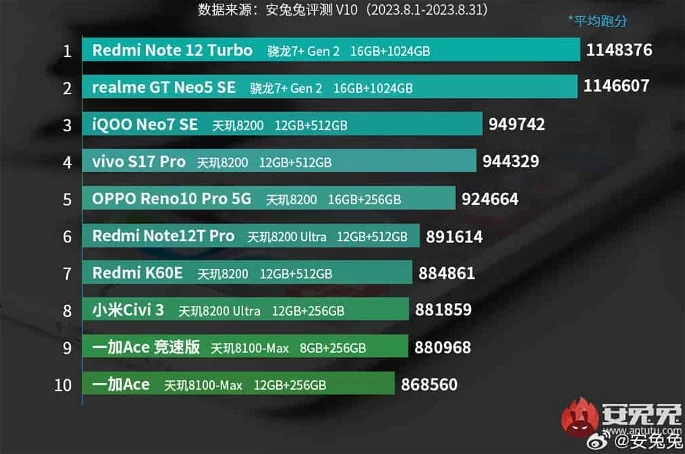 O Redmi Note 12 Turbo da Xiaomi conquistou o primeiro lugar com uma pontuação impressionante de 1.148.376 pontos. Este modelo não é apenas um sucesso de vendas, mas também um monstro de desempenho, graças ao seu processador Snapdragon 7+ Gen 2, até 16 GB de memória RAM e até 1 TB de armazenamento interno.