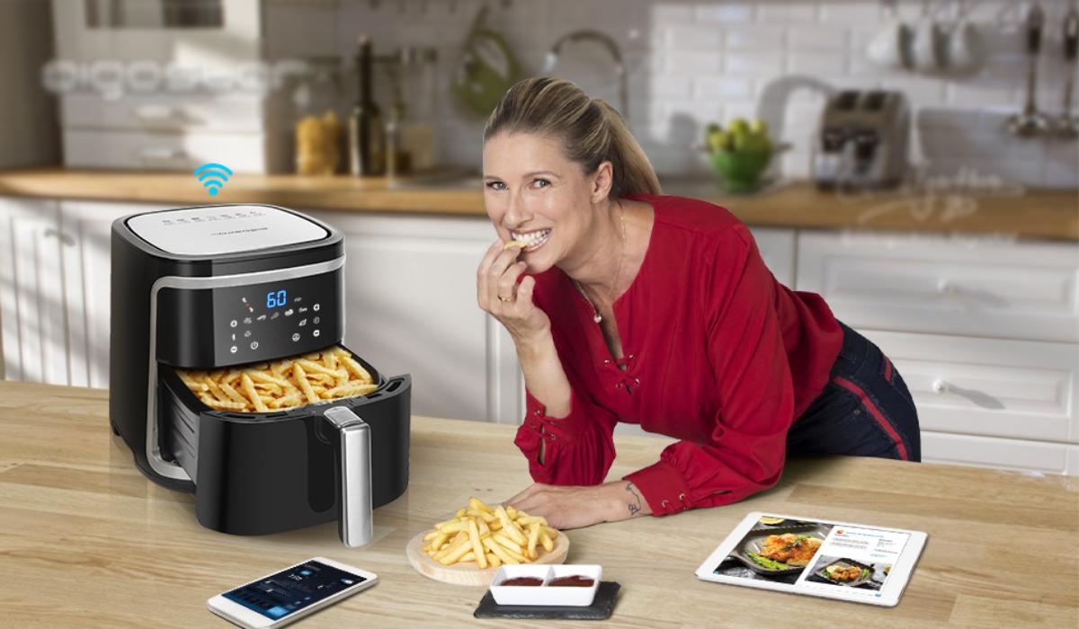 A Aigostar Cube Smart não é apenas uma fritadeira. É um avanço tecnológico na arte de cozinhar. Com capacidade de 7 litros, esta fritadeira de ar inteligente permite-lhe preparar refeições saudáveis para toda a família ou para um grupo de amigos. Além disso, graças à sua conexão Wi-Fi, pode controlar todas as funções a partir do seu smartphone, utilizando a aplicação AigoSmart. Esta funcionalidade traz uma nova dimensão de comodidade e controlo à sua cozinha.