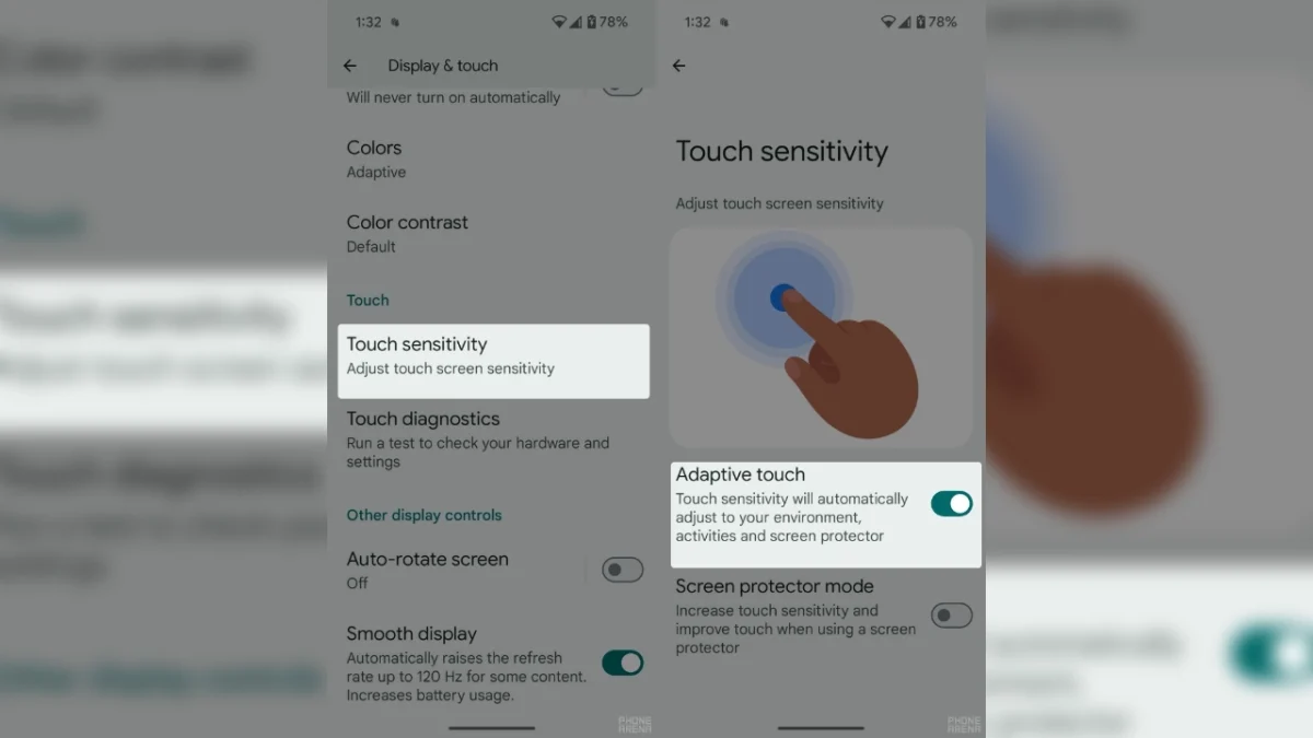 Embora a Google não tenha mencionado especificamente esta funcionalidade durante a apresentação do Pixel 9, ela foi descoberta pouco depois do lançamento do smartphone. O Adaptive Touch está localizado nas definições do telefone, em Ecrã > Sensibilidade ao toque.