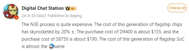 Segundo informações partilhadas pelo conhecido informador Digital Chat Station na rede social chinesa Weibo, tanto o Snapdragon 8 Gen 4 da Qualcomm como o Dimensity 9400 da MediaTek deverão ser cerca de 20% mais caros do que os seus antecessores. Este aumento é atribuído principalmente ao elevado custo do processo de fabrico de 3nm da TSMC, utilizado na produção destes chips de última geração.