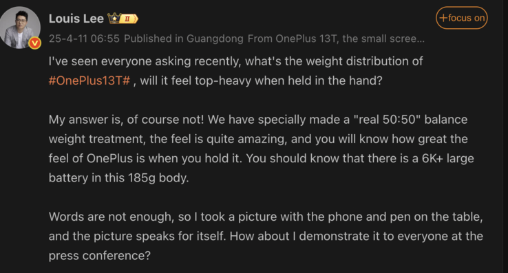 Louis Lee, presidente da OnePlus China, partilhou recentemente nas redes sociais uma imagem curiosa: o novo OnePlus 13T equilibrado sobre uma caneta. Este pequeno truque visual serve para ilustrar o que considera ser um dos grandes trunfos do equipamento — a sua distribuição de peso 50:50, que contribui para uma utilização mais cómoda e estável na mão.