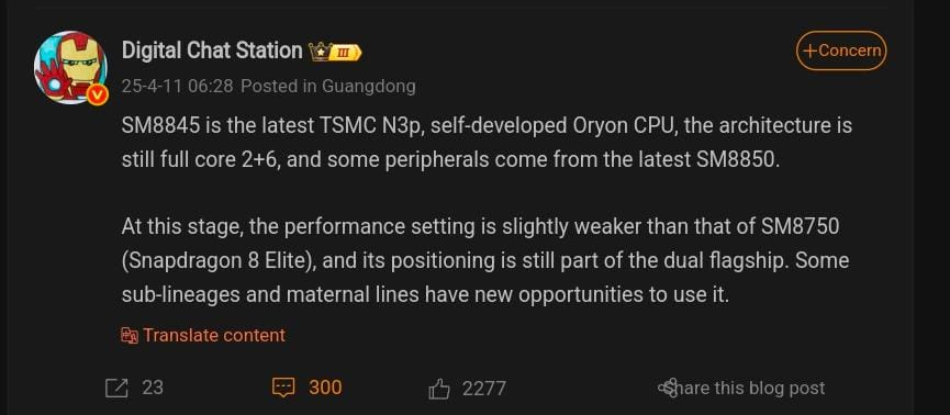 As primeiras informações sobre o SM8845 surgem através do conhecido leaker Digital Chat Station, que indica que a Qualcomm está a trabalhar ativamente neste chip para colmatar a diferença de desempenho entre o 8s Gen 4 — vocacionado para equipamentos mais acessíveis — e o Snapdragon 8 Elite, que se encontra reservado para os topos de gama, como o OnePlus 13 ou o Galaxy S25 Ultra.