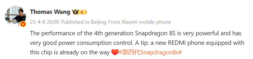 A Redmi prepara-se para apresentar ao mundo o seu novo smartphone de gama alta, o Turbo 4 Pro, já durante este mês de abril. A confirmação partiu de Wang Teng Thomas, diretor-geral da marca, que usou a rede social Weibo para dar algumas pistas sobre o equipamento e, sobretudo, para destacar o novo processador Snapdragon 8s Gen 4, que será o motor deste modelo.
