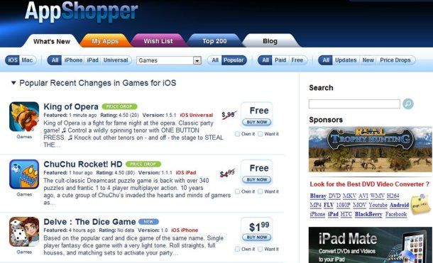 O AppShopper funciona basicamente como o Steamgamesales, o diferencial é o fato de possuir um app próprio que pode ser baixado no iTunes para iOS 4.0 ou superior. É possível comprar apps e jogos com grandes descontos e às vezes até mesmo de graça. Depois de baixar o app, você pode listar os jogos que já têm e os que deseja para receber um email quando houver promoções ou atualizações. O AppShapper também disponibiliza o RSS feed para quem quiser ficar à par das últimas promoções.