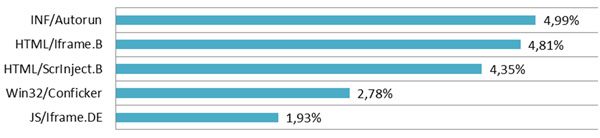O INF/Autorun representa uma grande variedade de malware que usa o ficheiro autorun.inf como forma de comprometer o PC. Este ficheiro aloja informações sobre programas que estão destinados a serem executados automaticamente sempre que um utilizador de um PC com o sistema Windows acede a uma unidade de armazenamento externa, (geralmente flash drives USB). O HTML/Iframe.B incide sobre a deteção genérica de tags IFRAME maliciosas embutidas em páginas HTML, que redirecionam o browser para um URL com uma localização específica que contém software perigoso. O HTML/ScrInject.B trabalha com a deteção genérica de páginas HTML que contém um scrip escondido, ou uma tag iframe, que redireciona automaticamente o utilizador para o download do malware.