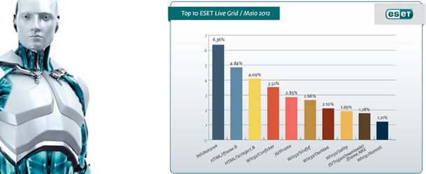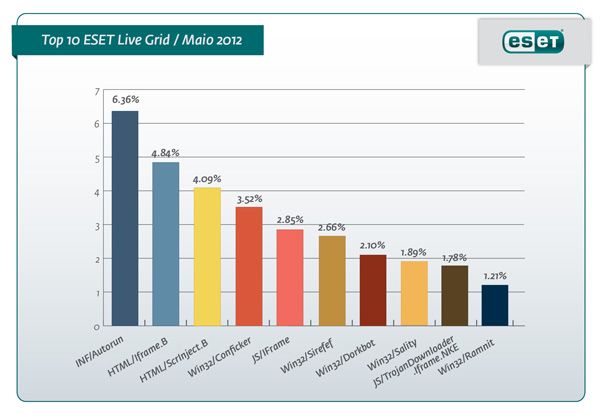 Ameaças globais de acordo com o ESET Live Grid® Statistics (maio de 2012)