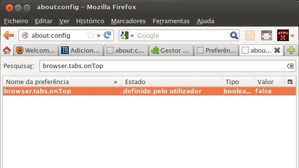 O firefox durante as primeiras versões sempre posicionou as abas acima do conteúdo do site visitado. Após a Google ter desenvolvido o Chrome e tornado as abas acima da barra da url, um “standard” o firefox seguiu a mesma tendência nas novas versões. Apesar deste aspecto, e se tinha apenas actualizado as versões anteriores que tinham este comportamento, poderá ter uma surpresa quando actualizar para o firefox 15. Isto porque o firefox mudou permanentemente a colocação das abas para cima da barra de URL mesmo nas versões antigas, como omissão. Se pretende manter o comportamento antigo digite about:config, e procure browser.tabs.onTop e clique duas vezes (valor a false)