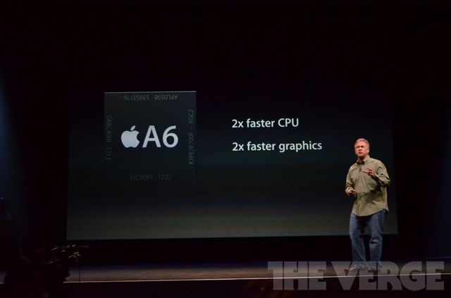 É anunciado o novo processador A6, um salto significativo quando comparado com o A5 com um processador 2x mais rapido e um GPU também com um incremento de 2 velocidades.