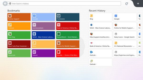 Esta nova versão inclui uma nova página inicial redesenhada para respeitar as linhas orientadoras do Modern UI com acesso rápido ao histórico de páginas navegadas e às bookmarks. É ainda incluído nesta versão acesso ao serviço Firefox Sync e ainda suporte a elementos optimizados para toque, “swipe” e gestos integrados com a barra “charms” do Windows 8.