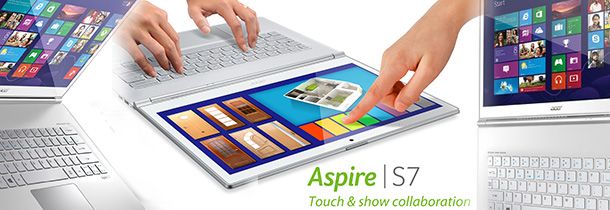 Aclamado como um dos mais interessantes Ultrabooks táteis com Windows 8 para a próxima época natalícia, os Ultrabook S7 da Acer são tão finos como um tablet e ostentam um desenho simples e limpo. Com a sua caixa “unibody” totalmente em alumínio, os Ultrabook Acer S7 são excecionalmente finos e leves, mas ao mesmo tempo resistentes e duráveis. Consoante o modelo, têm uma espessura desde 1,19 cm e um peso a partir de apenas 1 Kg com ecrãs táteis de 13,3’’ ou 11,6’’ Full HD (1920 x 1080) protegidos por tampas rígidas produzidos em Gorilla Glass 2 branco ou alumínio.
