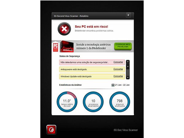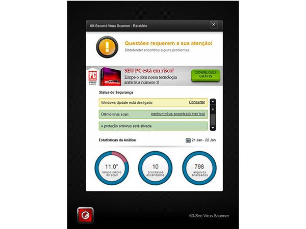 O 60-Second Virus Scanner da Bitdefender oferece a todos os usuários de PC a confiança de saberem que seu sistema foi verificado por uma tecnologia de escaneamento proativa, que vai identificar ameaças ativas. E está disponível de graça, a qualquer hora, com o clique de um ícone da área de trabalho.