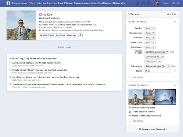 Zuckerberg deu alguns exemplos. Procurou pelos amigos que estariam interessado em assistir à popular série “Game of Thrones” com ele. Ele fez uma pesquisa de amigos que viviam em Palo Alto e viam a série. O resultado da sua pesquisa indicaram que 17 de seus amigos de facto se enquadravam nessa pesquisa, incluindo sua irmã Donna Zuckeberg.