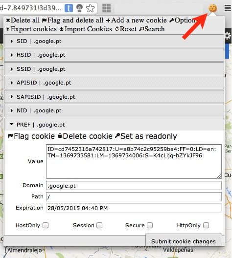 Quando reabrir o seu browser, verá no canto superior direito um ícone que parece uma bolacha (“cookie”). Com a página do Google Maps aberta carregue nesse ícone e aparecer-lhe-à a janela que está na foto. Não se intimide com uma linguagem tão complicada. Vamos ver passo-a-passo.