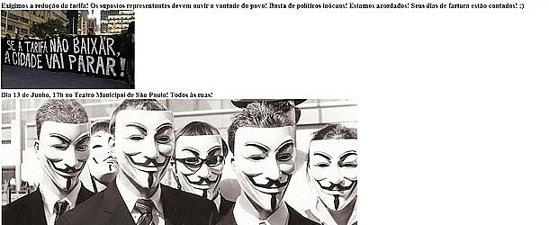 Durante a noite de ontem, o site da Secretaria de Educação de SP exibiu duas imagens, uma de manifestações realizadas no estado ao longo dos últimos dias e, outra de ativistas utilizando as máscaras de Guy Fawkes, um símbolo do grupo. O protesto exigia ainda que as tarifas do transporte público na cidade fossem reduzidas: “Exigimos a redução da tarifa! Os supostos representantes devem ouvir a vontade do povo. Basta de políticos inócuos. Estamos acordados! Seus dias de fartura estão contados!”.