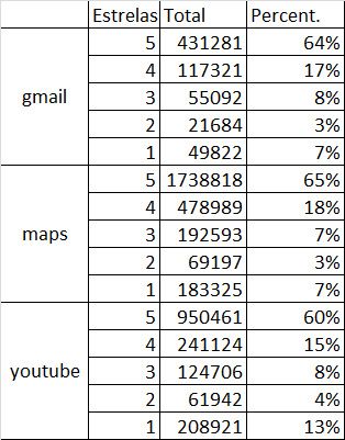 A percentagem de utilizadores que atribuíram 1 e 2 estrelas ao hangout situa-se nos 37% um valor bastante penalizador para os Hangouts. De forma oposta apenas 53% dos utilizadores ficaram satisfeitos ou muito satisfeitos com o substituto do Google Talk. Embora seja mais que metade, está muito longe do nível de satisfação das restantes aplicações da Google. Aproveitei portanto para calcular as mesmas percentagens para as aplicações Gmail, Maps e Youtube da Google. Os dados tornam-se ainda mais esclarecedores e são apresentados na tabela seguinte