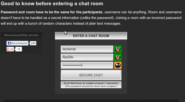 Para criar a sua sessão de chat , procure a secção ENTER A CHAT ROOM na página inicial, especifique o nome da sua sala de chat, escolha um nome de utilizador/usuário para o identificar e, mais importante, especifique a senha que será usada para partilhar a mesma sala de chat com outros participantes. De modo a permitir que qualquer pessoa participe na sessão, vai ter que lhe fornecer o nome da sala de chat exacta, e a senha que você escolheu para ela. O nome de utilizador/usuário – que funciona como a identidade de cada participante – será diferente para cada membro da sala de chat, como é normal em qualquer chat. Depois de especificar os detalhes necessários, clique no botão SECURE CHAT para para iniciar a sessão de chat segura.