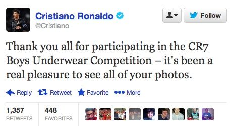 O tweet é no mínimo passível de várias interpretações e terá sido colocado online pela assessoria de comunicação do jogador. Não se sabe se quem o postou deu por isso ou se foi o próprio CR7 a aperceber-se de que uma frase como “obrigado por terem participado no concurso de roupa interior para rapazes: foi um prazer ver todas as vossas fotos” poderia ser muito mal interpretado.