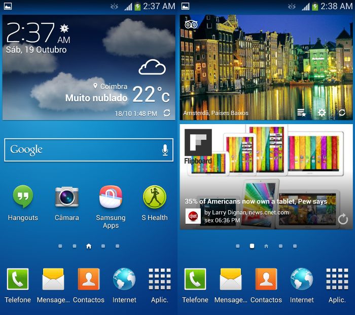 A versão do Galaxy S4 que testámos, inclui de fábrica o Android 4.2.2 (Jelly Bean), embora ao que tudo indica este smartphone vai receber a actualização para a versão Kit Kat. Com já vem sendo normal, o Galaxy S4 traz uma personalização da aparência do Android (uma “skin”) criada pela Samsung, e designada como TouchWiz. Não somos particularmente entusiastas desta modificação, embora compreendemos que os fabricantes sintam a necessidade de diferenciar a sua oferta (no final é tudo uma questão de branding). Felizmente, longe vão os tempos em que o Touchwiz era uma versão “iPhonizada” do Android.