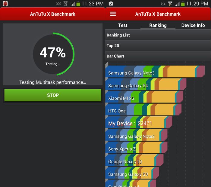 Mas se as nossas impressões são insuficientes para si, existe sempre o campo formal das benchmarks para poder dissipar algumas dúvidas. Contudo as benchmarks não são totalmente precisas, porque como recentemente se viu num estudo independente, podem ser instrumentalizadas pelos fabricantes. Contudo, para estabelecer um termo de comparação, usámos a única benchmark actual que, segundo os autores foi construída para combater a manipulação de resultados – a Antutu X Benchmark. Na execução da benchmark foram testados os vários itens do Smartphone como a CPU, GPU, I/O, RAM e UX. O Galaxy S4 foi reiniciado antes da execução da benchmark, de modo a impedir uma contaminação dos resultados da benchmark por algum processo a executar em fundo. Os resultados foram os seguintes: