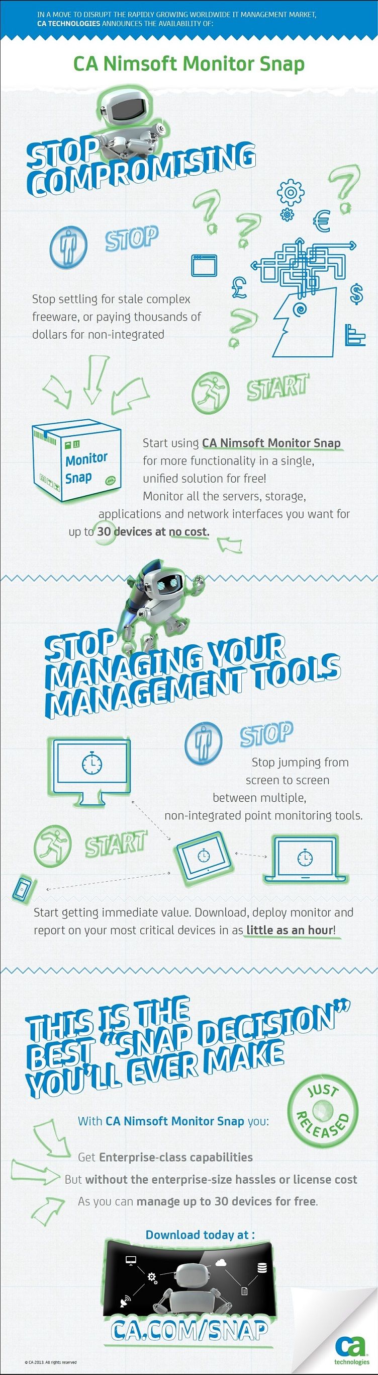 “Até hoje, os clientes com escassos ou limitados recursos enfrentavam uma escolha inaceitável entre ferramentas pontuais e não integradas de monitorização, código open source que sempre apresenta desafios técnicos e tecnologias convencionais de classe empresarial, com um custo e um tempo de implementação elevados”, disse John Smith, General Manager, Infrastructure Management, CA Technologies. “Com o CA Nimsoft Monitor Snap, estes clientes encontram finalmente uma solução que responde genuinamente às suas necessidades específicas”.