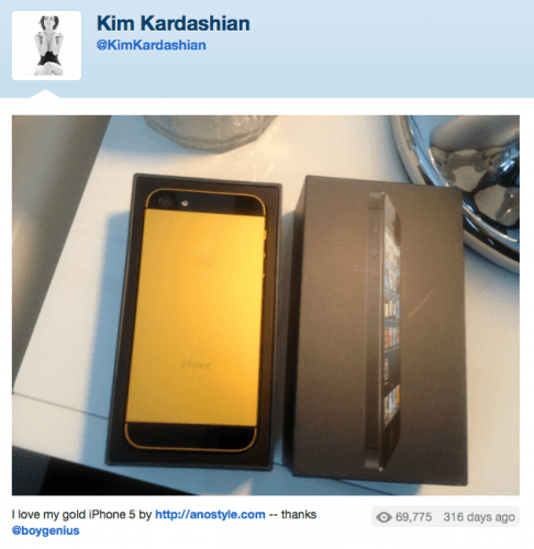 Kim Kardashian é uma socialite norte-americana de curvas generosas que tem um reality show que faz as delícias de quem gosta do género. Glamorosa, Kardashian mostrou em dezembro na sua conta do Twitter um iPhone quitado com capa de ouro e por causa disso, o novo topo de gama da Apple é conhecido internamente como o Kardashian.
