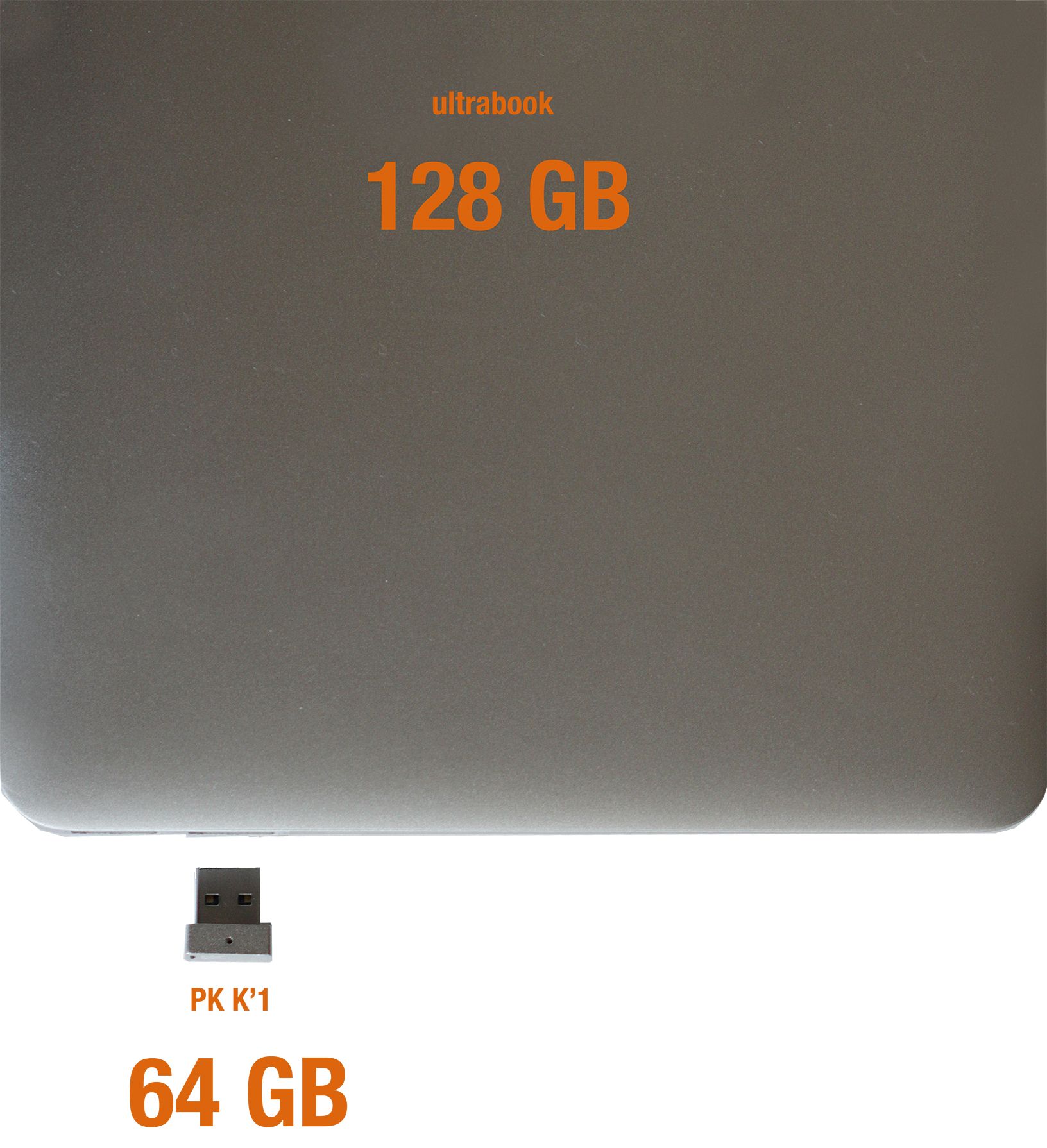 A PK K’1 é a pen USB 3.0 mais pequena do mundo com as extraordinárias medidas de 16.8 x 16 x 7 milímetros. O seu design foi concebido especialmente para não afetar a ergonomia e design dos já famosos Ultrabooks. Ao ser conectada num PC ou Mac a PK K’1 integra-se na perfeição no computador tornando-se quase invisível pois apenas fica com 5 milímetros à vista.