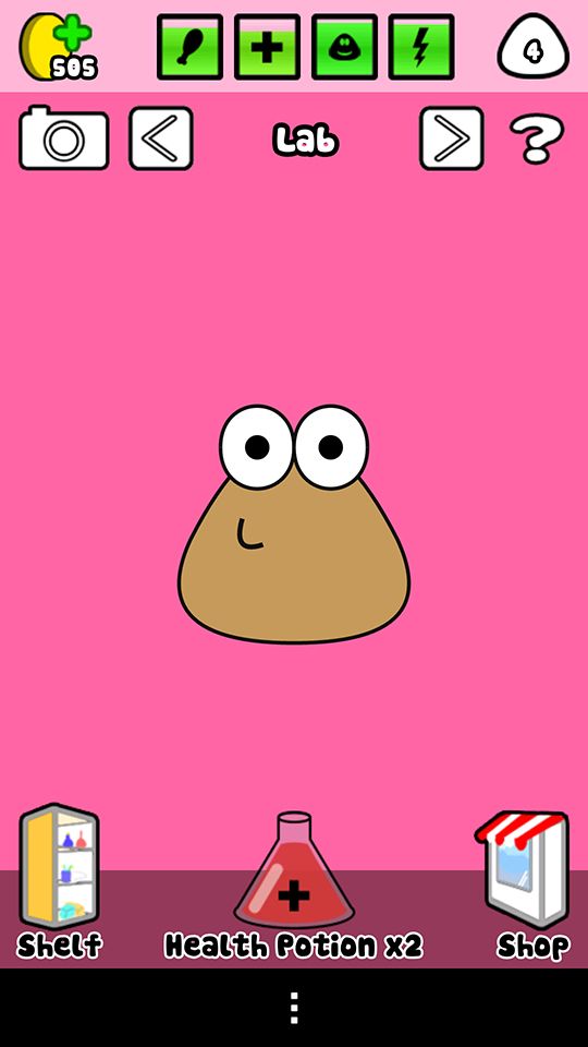 Vai ser preciso recorrer ao laboratório em duas situações distintas, quando o Pou estiver com os níveis de saúde muito baixos ou então para lhe dar um elixir que server para alternar de forma imediata entre a fase bebé e adulta ou vice versa.