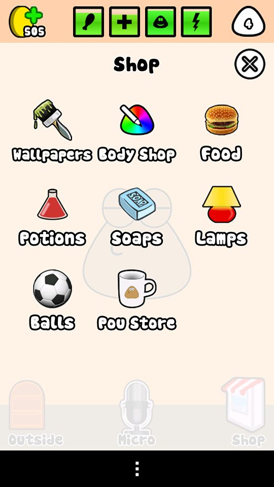 O bichinho virtual Tamagotchi foi a verdadeira febre da década de 90 e à bem pouco tempo renasceu para o Android embora não tivesse grande sucesso, Pou vem trazer uma nova abordagem sendo um alien de estimação virtual que oferece aos utilizadores um mundo cheio de interactividade e diversão.