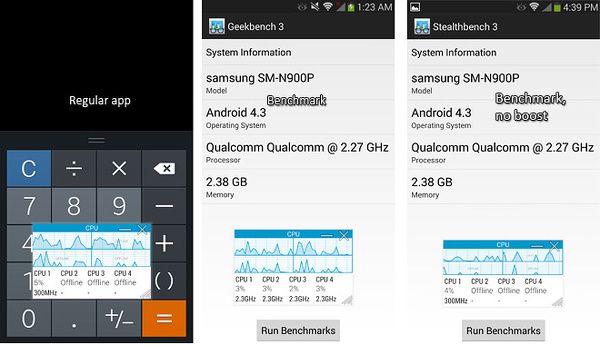 Numa segunda experiência a Ars Tecnhica utilizou a mesma ferramenta de monitorização e alterou as benchmarks de modo a forçar o CPU do Galaxy Note 3 a sair do modo “idle“. A execução da Geekbench nestas condições permitiu observar incrementos de 20% no desempenho, enquanto a execução da Linpack (também uma versão alterada) demonstrou uma diferença de 50%.