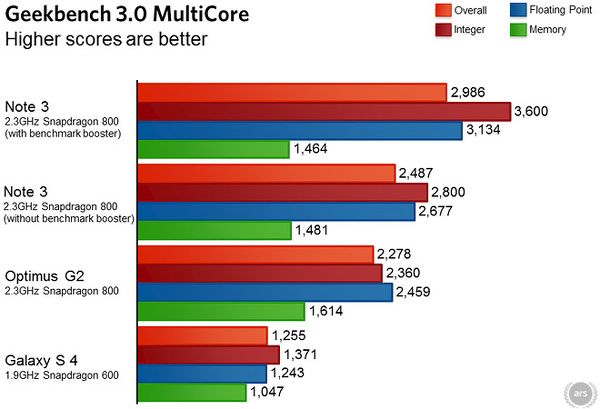Intrigado com este cenário, o site Ars Technica, desenvolveu um conjunto de experiências, de modo a apurar quais eram as causas desta diferença. Através de uma ferramenta de monitorização de CPU e benchmarks personalizadas, o site descobriu que a Samsung introduziu mecanismos no Galaxy Note 3 de modo a detectar algumas benchmarks e activar todos os núcleos de CPU (quatro núcleos) e forçar a capacidade máxima de processamento de 2,26 GHz.