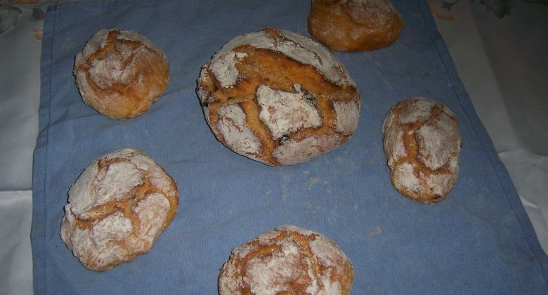 Amasse cuidadosamente e sempre que necessário, junte água da cozedura. No fim de bem amassado,tape bem o recipiente, deixe levedar até que a massa duplique o volume, junte á massa as passas cortadas e tenda numa tijela as broas pequenas, ou grandes ( ao gosto). Leve ao forno durante uma hora num tabuleiro untado de azeite ou margarina.