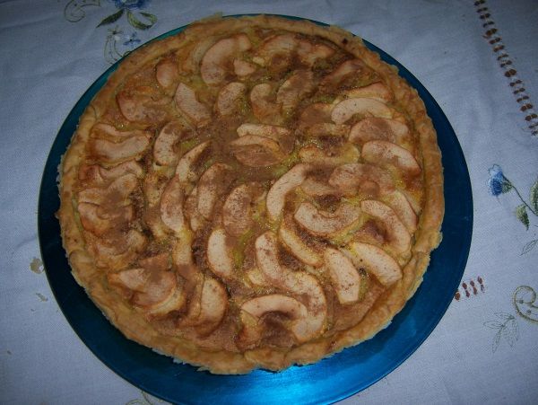 Forre uma tarteira de fundo amovível com a massa folhada (ou quebrada). No fim de a tarteira estar totalmente forrada, espalhe um pouco de canela e de seguinda junte o recheio que foi anteriormente confeccionado.Adicione a maçã por cima do recheio, até que o recheio fique totalmente preenchido pelas fatias de maçã.
