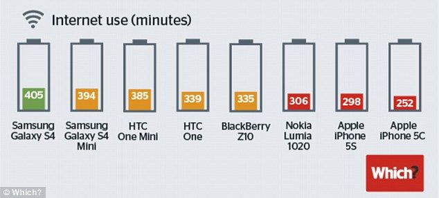 Um estudo feito pela Which? magazine comparou a performance de 8 smartphones de topo em relação à vida útil das suas baterias, e neste estudo foram incluídos o Galaxy S4, HTC One, Galaxy S4 Mini, iPhone 5S, Blackberry Z10, HTC One Mini, iPhone 5C e Nokia Lumia 1020.