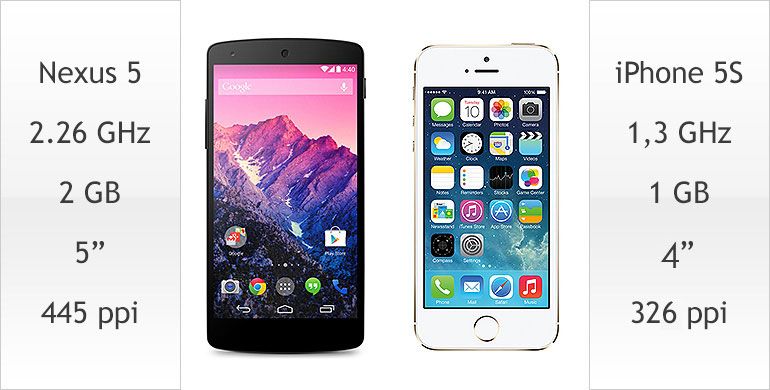 O novo smartphone da Google está equipado com a tecnologia mais recente, apresenta uma tela/ecrã de 5 polegadas e o preço é o de um verdadeiro low cost. O iPhone 5S tem um design irrepreensível (apesar de não ser uma novidade), tem uma excelente performance, a vida útil da bateria é uma das melhores da sua classe, mas o preço não se compara com o do Nexus 5. Na realidade, neste segmento de mercado, o dispositivo da Google bate toda a concorrência (o único que se aproxima é o Huawei Ascend P6, cuja análise publicamos no dia 30 de outubro).