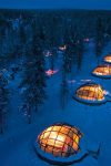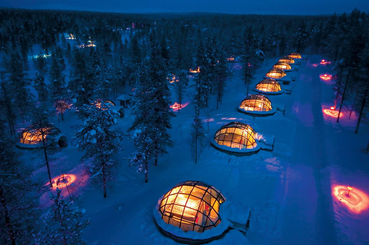 Se quer descobrir o melhor da Lapónia, o Hotel Igloo Village Kakslauttanen é um excelente ponto de partida: para além de ficar hospedado num hotel de gelo, pode ainda observar renas, huskies siberianos e a aurora boreal. Os hóspedes podem escolher entre casas de madeira individuais, iglus de gelo tradicionais ou iglus futuristas. Nos iglus de gelo pode pôr-se na pele dos habitantes tradicionais das terras do norte, enquanto que os iglus de vidro permitem um visão desobstruída do imenso céu estrelado. Durante o dia, o hotel oferece viagens de motos de neve, bem como de trenós puxados por renas ou huskies. Pesca ou caminhadas no gelo são outras das possibilidades. À noite pode usufruir das várias comodidades do Igloo Village, nomeadamente da maior sauna de vapor do mundo, de um bar de gelo e de um restaurante de neve.