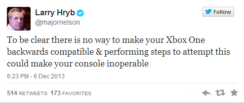 A Microsoft, através de Larry Hryb (o famoso Major Nelson, programador chefe da Xbox Live), alertou aos usuários sobre o boato que circulou na internet sobre forçar a retrocompatibilidade do One com o Xbox 360.