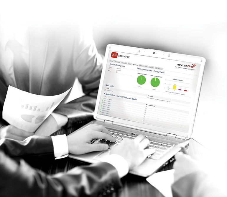 O serviço OneCockpit inclui um painel de instrumentos, sempre disponível, que apresenta indicadores de disponibilidade e desempenho da infra-estrutura de rede e aplicações aos clientes da NextiraOne. O OneCockpit cria uma poderosa solução de gestão e monitorização end-to-end totalmente integrada no portfólio de serviços da NextiraOne.