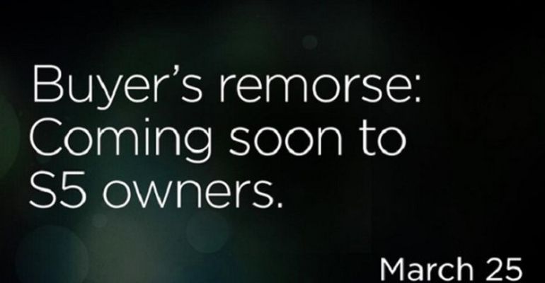 A mensagem não poderia ser mais claro do que é, sugerindo que os utilizadores irão sentir remorsos por adquirirem um Galaxy S5 quando o novo HTC One for oficialmente revelado no dia 25 de Março. Pouco tempo depois da imagem ser publicada na conta oficial da HTC no Twitter a Samsung revelou que o novo S5 apenas será lançado no mercado em Abril.