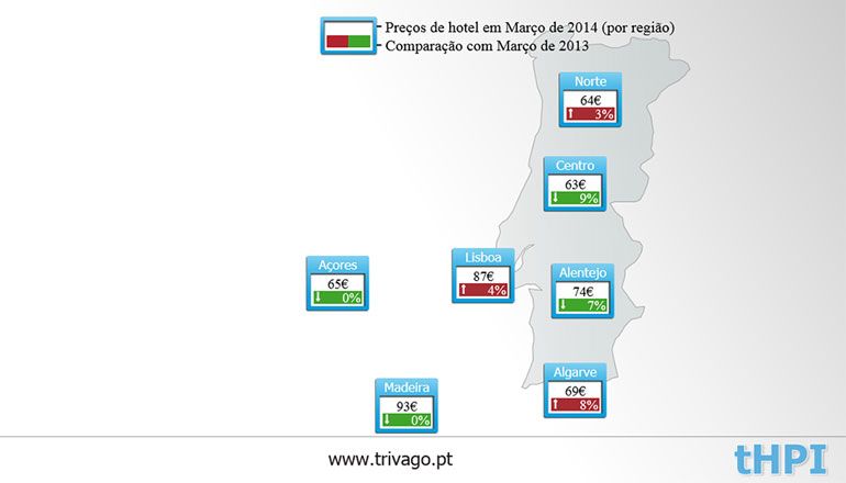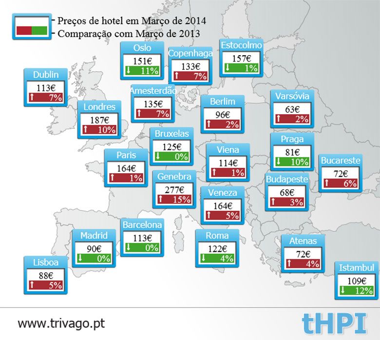 O arranque de 2014 foi especialmente penalizador para os hotéis europeus e, ainda que a maioria do continente tenha visto os seus preços subir este mês, muitos países registam quedas face ao período homólogo, nomeadamente Espanha (-3%), Itália (-4%) e França (-7%). No sul europeu só a Grécia (+3%) viu o custo das suas dormidas subir em relação a Março de 2013, situando-se a leste um dos maiores aumentos do continente, mais precisamente na Roménia (+5%).