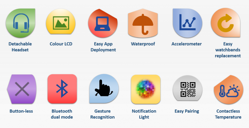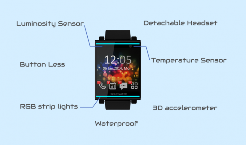 O “HeadWatch” vem com um clip na sua parte traseira que permite o encaixe na orelha de forma segura, garantindo assim que o dispositivo não cai durante as suas chamadas. Enquanto smartwatch, irá poder ver as suas mensagens e emails através do seu ecrã touchscreen colorido. O “HeadWatch” tem também incorporados um acelerómetro 3D, luzes RGB no seu topo e base, sensor de luminosidade, sensor de temperatura e um design totalmente sem botões.